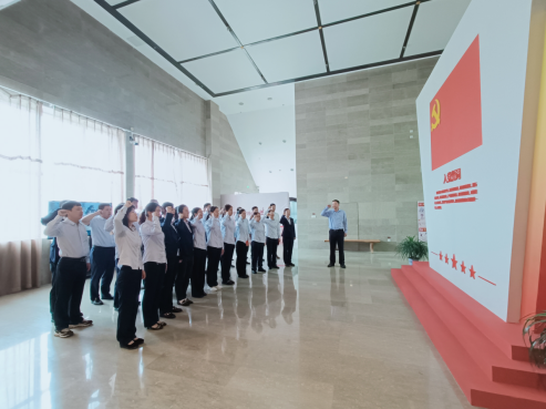 隨后,全體黨員列隊(duì)整齊,面向黨旗,高舉右手,由黨總支書記帶領(lǐng)全行黨員莊嚴(yán)宣誓,重溫入黨誓詞。鏗鏘誓言,彰顯了大家聽黨話、感黨恩、跟黨走的堅(jiān)定決心。