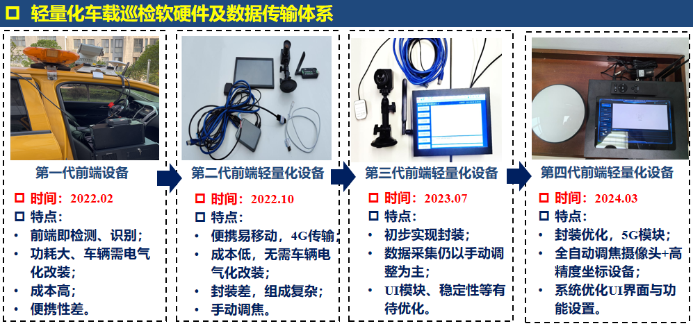 項目自立項研究至今,前后歷經(jīng)了四代前端檢測設(shè)備的研發(fā)與優(yōu)化,從最初需要電氣化改裝的車載設(shè)備,到輕量化手動采集,再到初步實現(xiàn)封裝實用化設(shè)計,最終在現(xiàn)階段實現(xiàn)全自動對焦數(shù)據(jù)采集與5G傳輸智能化巡檢體系。